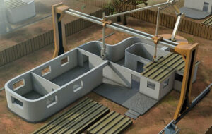 A construção civil adota a impressão 3D em projetos de casas, prédios e pontes, reduzindo custos, tempo e impacto ambiental.